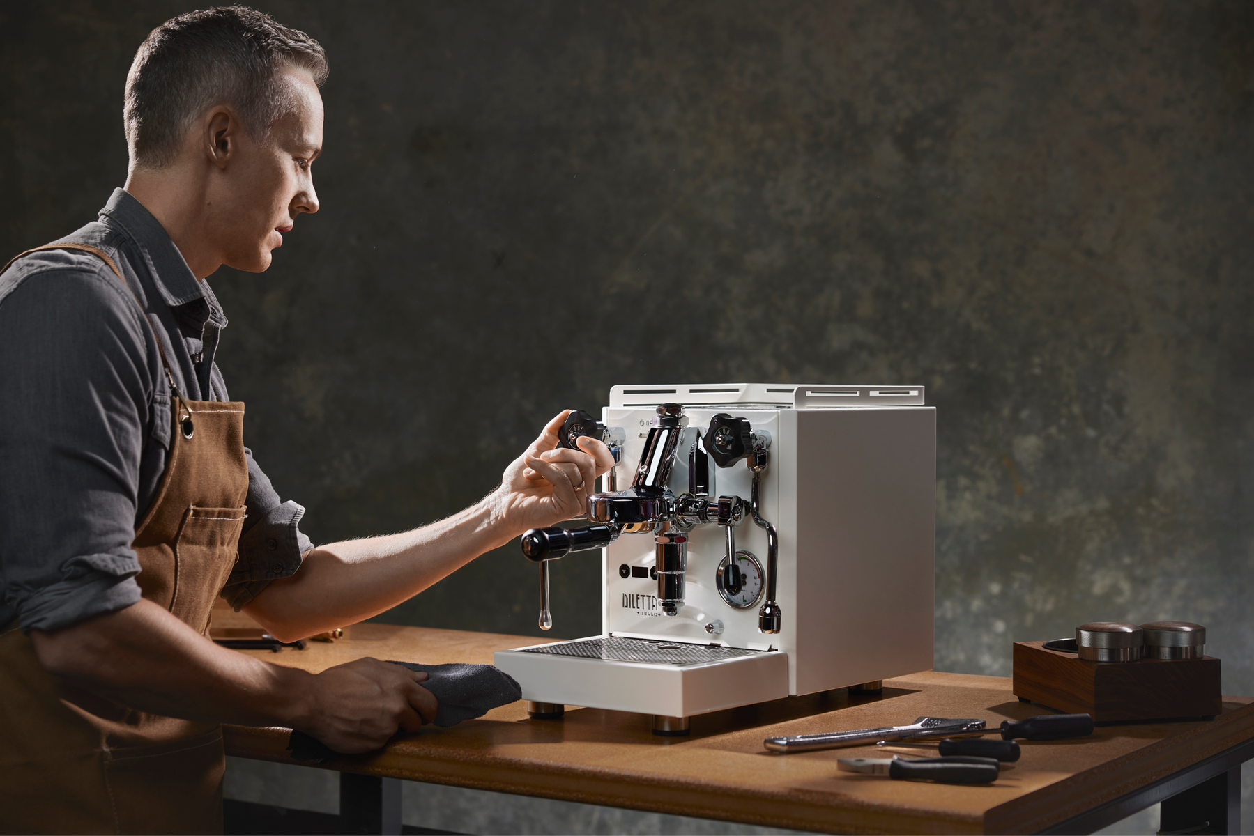 Ergonomic hardware for a barista-centric workflow.